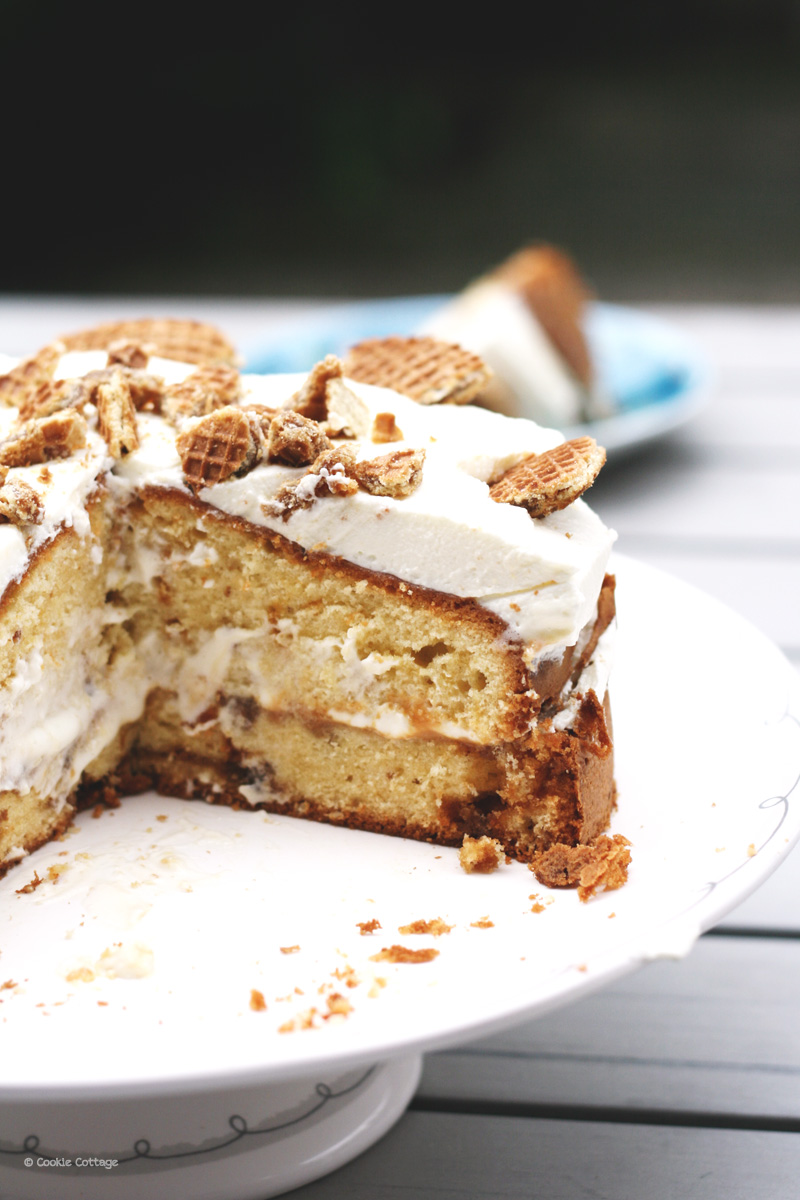 Laat de cake na het bakken even goed afkoelen en snijd het daarna met een broodmes doormidden. Smeer de onderste laag goed in met dulce de leche en verdeel er één derde van de geklopte slagroom over (klop hiervoor 250 ml slagroom stijf met 3 kleine theelepels suiker). Doe de bovenste helft van de cake weer terug en verdeel de rest van de slagroom over de bovenkant van de cake. Snijd de twee achtergehouden stroopwafels in partjes en decoreer je cake daarmee. Et voilá een aantrekkelijke cake.