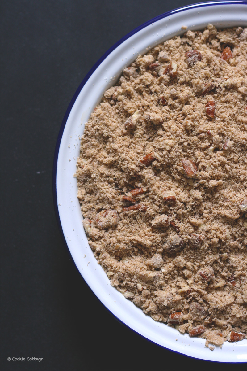 Het idee voor mijn crumbletopping heb ik uit het boek A year of Pies van Ashley English die de combinatie met pecannoten gebruikt op haar perzikkruimeltaart. Als inspiratie voor de vulling werp ik een blik op mijn drankvoorraad op zoek naar een likeur met vanille-achtige smaak, dat lijkt me heerlijk bij de pruimen. Tevergeefs zoek ik naar een laatste restje Cuarante y tres (Licor 43). Ik schuif nog wat flessen opzij en zie daar in het hoekje nog een fles met Tia Maria staan. Ik ruik er even aan en weerhoud mezelf om een slokje te nemen. Tia Maria it is!
